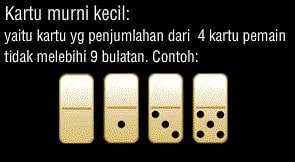 - Kartu murni kecil yaitu 4 kartu yang di miliki pemain jumlah keseluruhan bulatannya tidak lebih dari 9 bulatan.